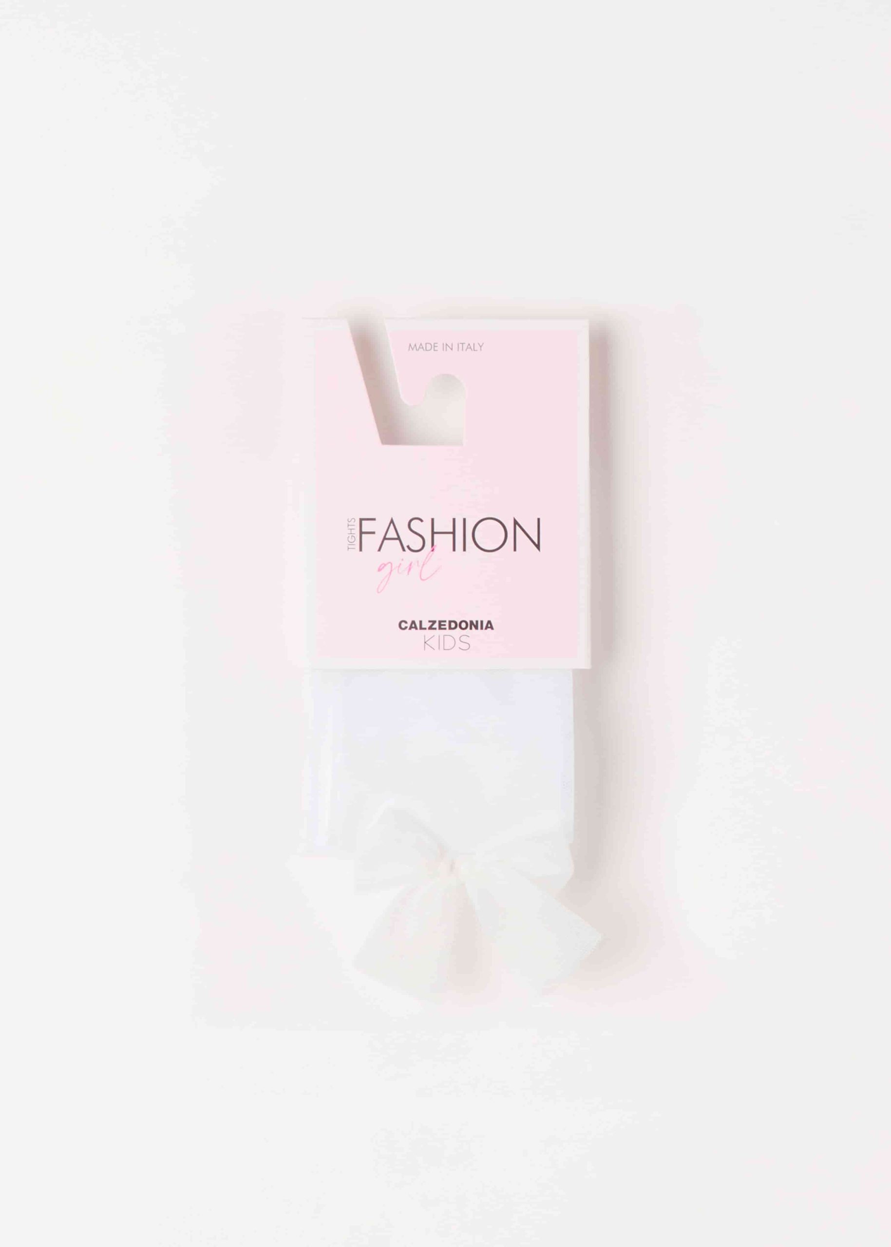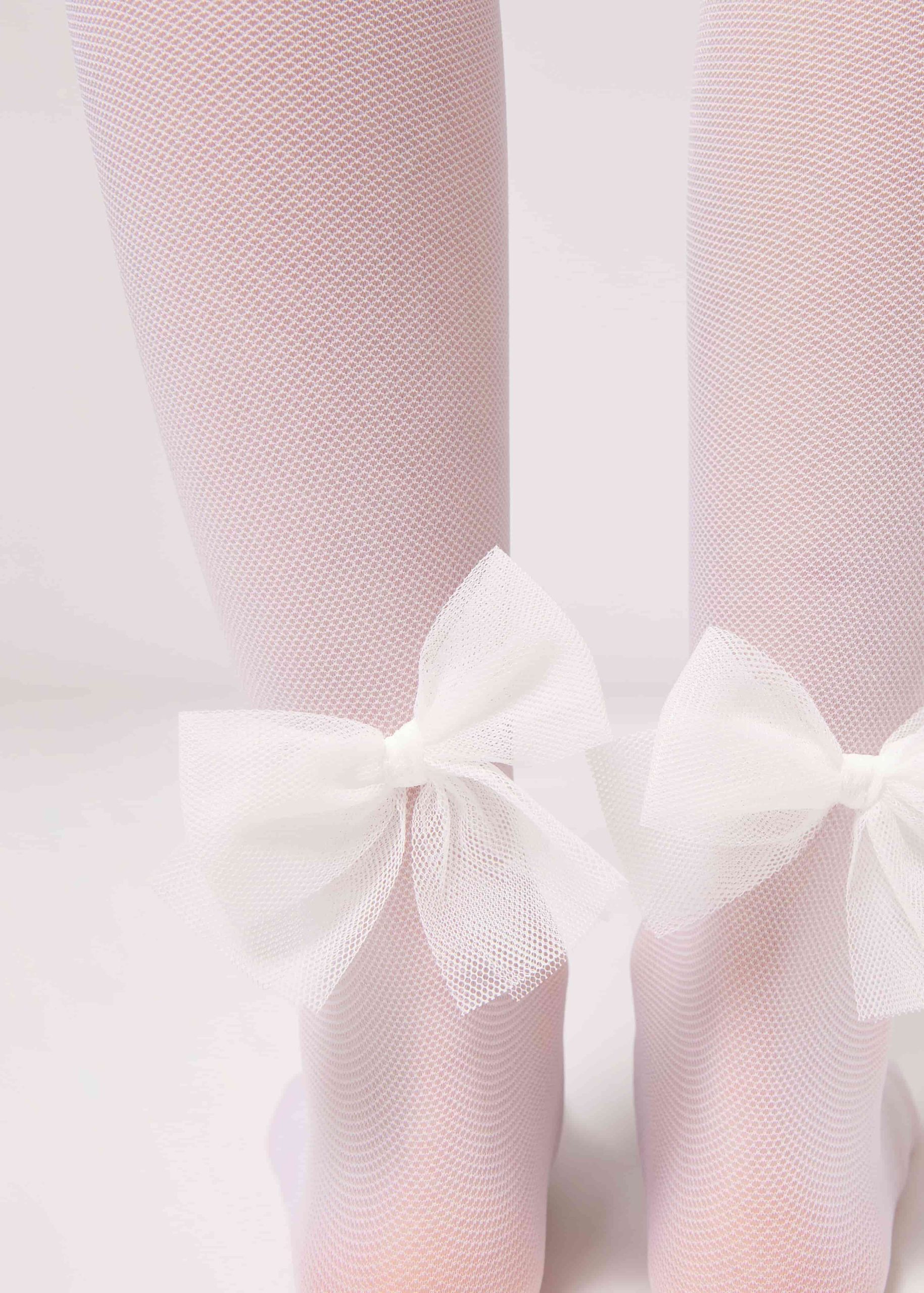 Girls’ 30 denier tulle tights with elegant bow appliqué.
