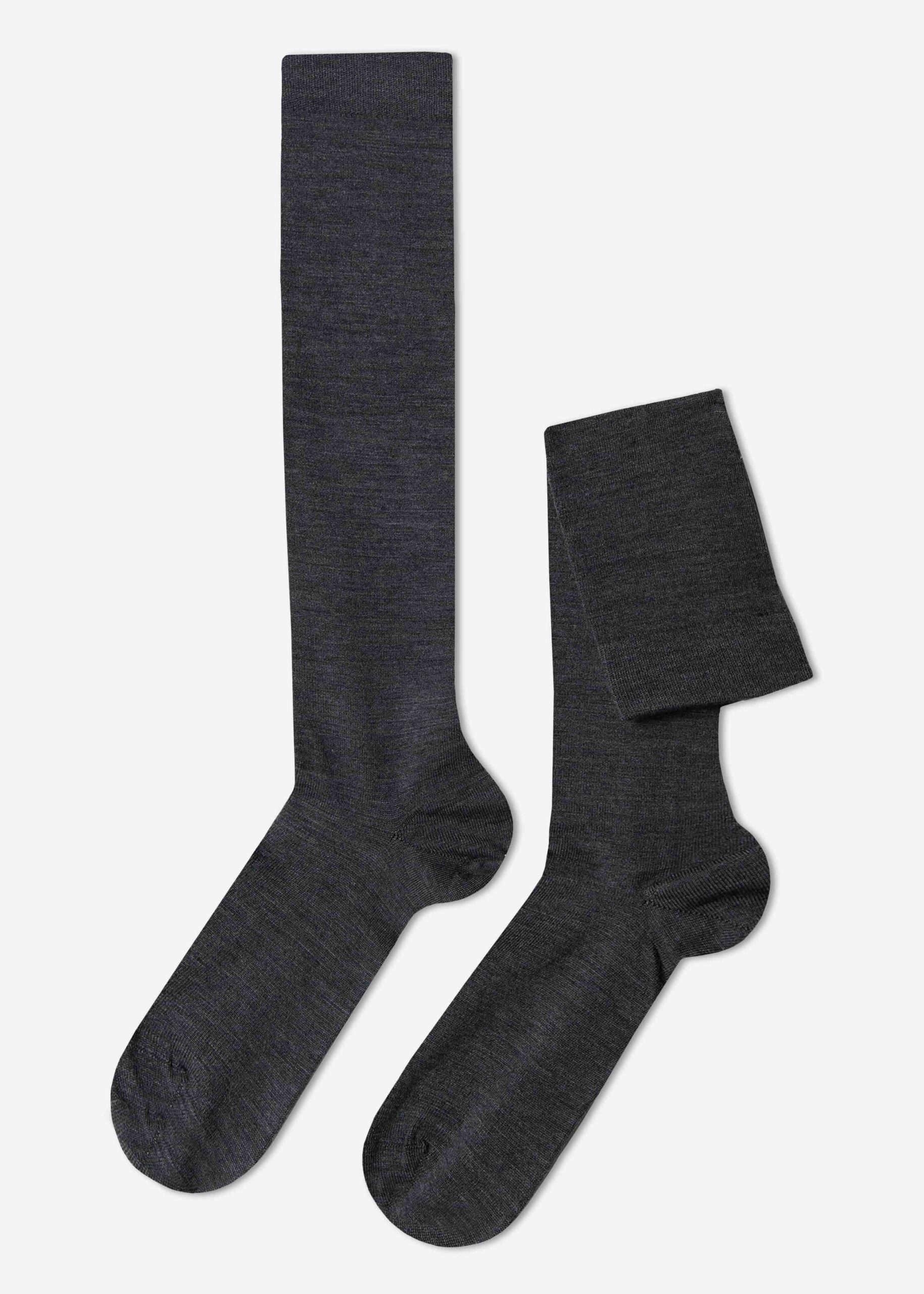 Men’s long socks with a wool exterior and a soft, cotton interior against the skin.