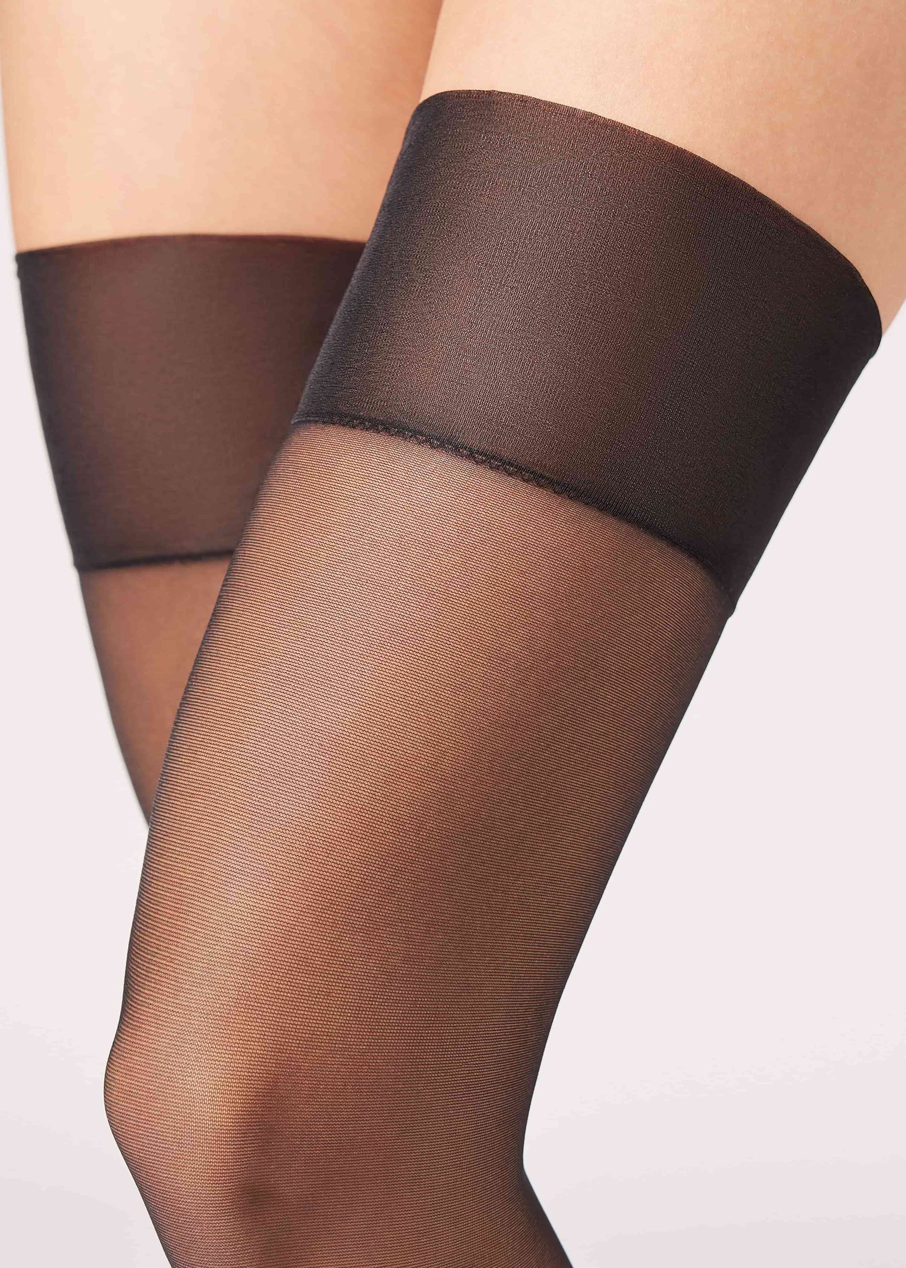20 denier sheer garter belt-effect socks with invisible toe and new sheer edge.