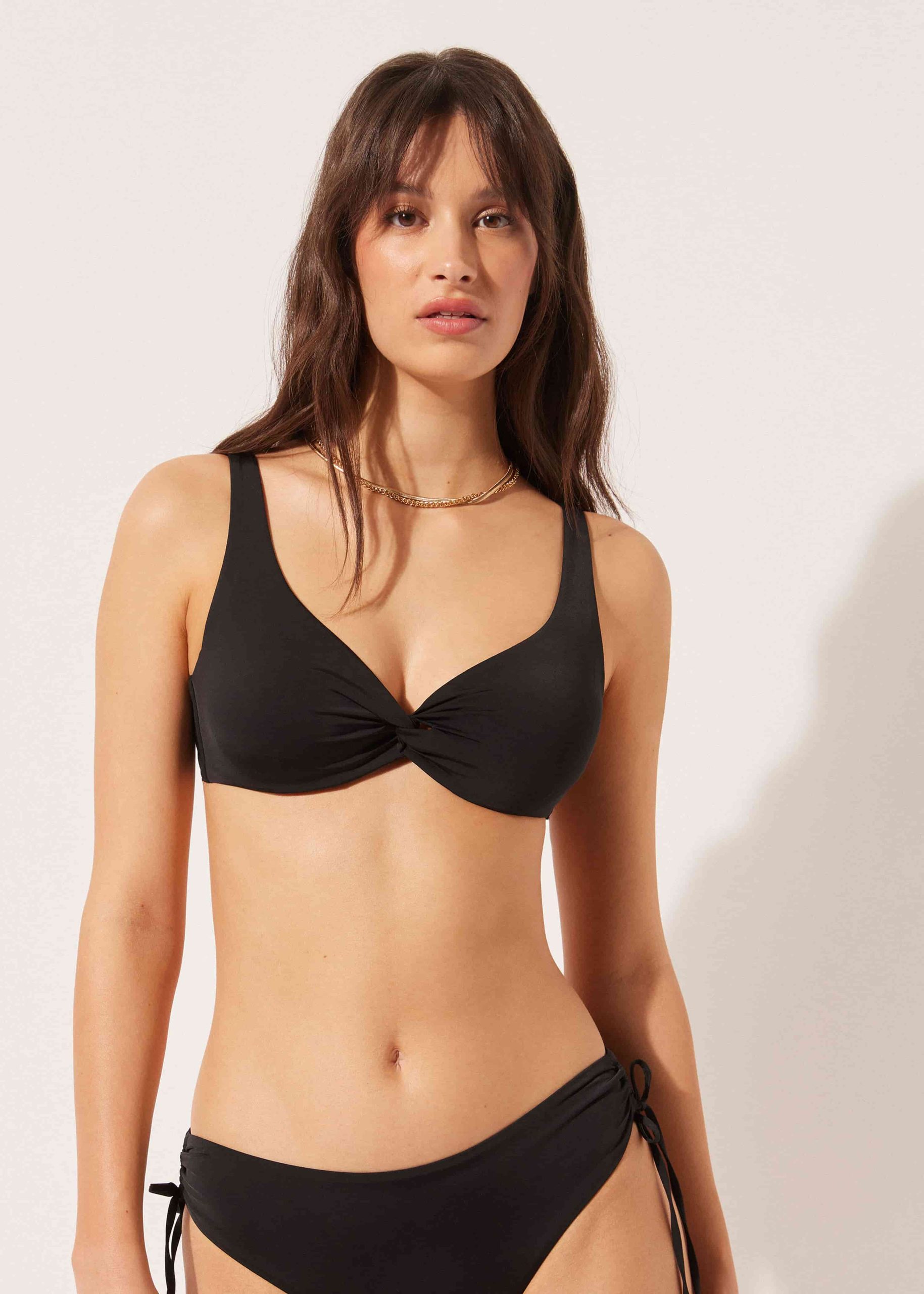 The balconette swimsuit top combines timeless elegance with thoughtful design, making it a standout knot-front bikini. Featuring unpadded cups with underwire and a central knot detail, this top delivers a flattering shape and secure fit for larger busts. The wide, side boning, and tulle-lined cups ensure excellent support while maintaining a smooth silhouette. Crafted from ultra-soft fabric, it feels light and comfortable against the skin, perfect for all-day beach or pool wear. The adjustable and removable straps can be styled multiple ways—crossed at the back, tied behind the neck, or hooked onto the band at different points to suit your physique. A sturdy back closure with two hook-and-eye adjusters guarantees a custom fit and added underband support. Whether you’re lounging or swimming, this knot detail bikini blends sophisticated style with reliable structure, making it a versatile choice for your swimwear collection.