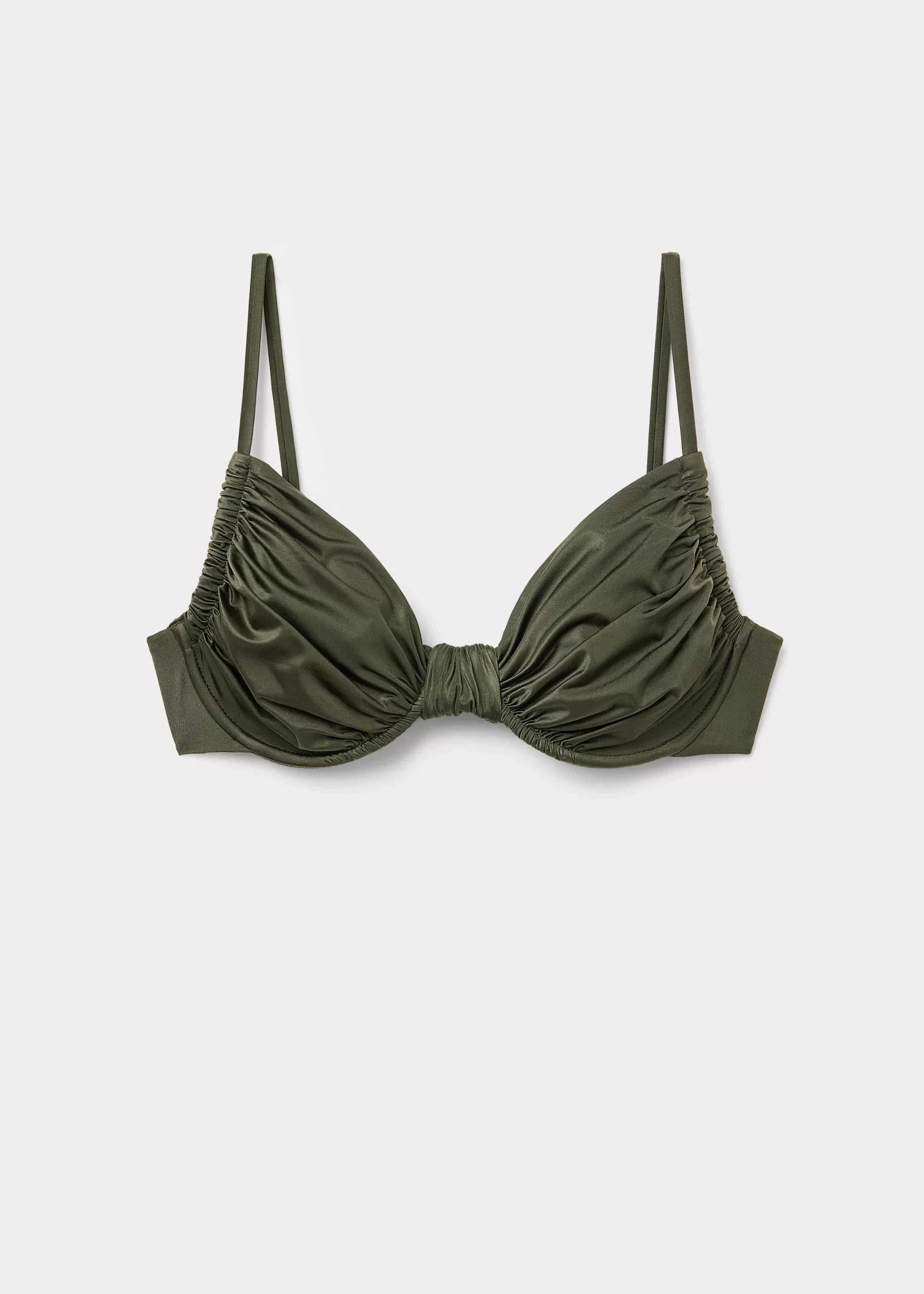 Non-padded balconette bikini top with underwire. The structure of the cups supports and cups the bust perfectly and the fit can be adjusted with the side drawstring. Ideal for the larger bust. The style features shiny satin-effect fabric embellished with ruching and gold-tone ends. Adjustable shoulder straps and clasp fastening with double adjusters.
