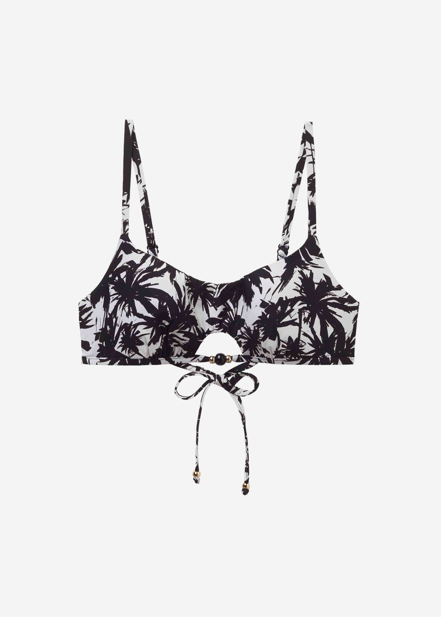 Non-wired brassiere bikini top with lightly padded cups. The side boning helps to support the bust. The style features an opening at the bridge embellished with two-tone beads. Black and white palm print. Adjustable shoulder straps and thin tie fastening at the back embellished with gold-tone beads on the ends.