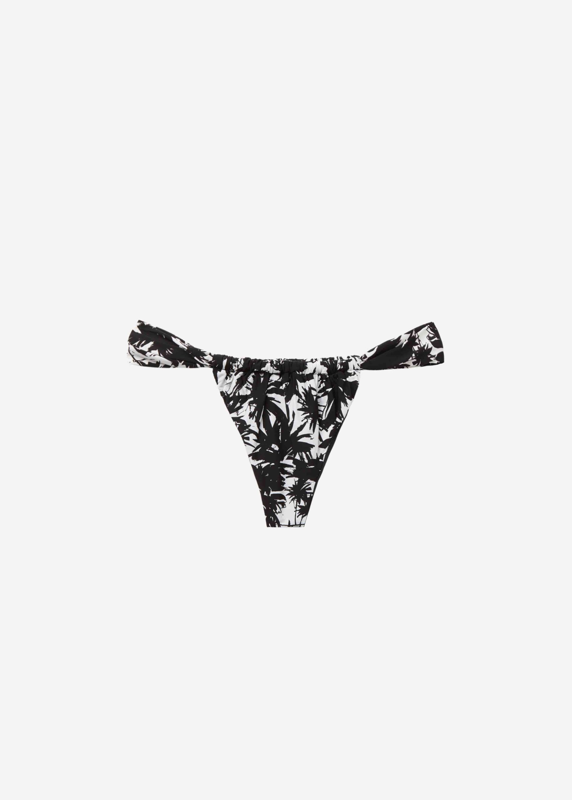 Brazilian bikini bottoms with invisible seams. The slightly rounded waist at the front allows for wear with classic coverage or a higher leg, depending on your body shape. The style features fabric with a black and white palm pattern.