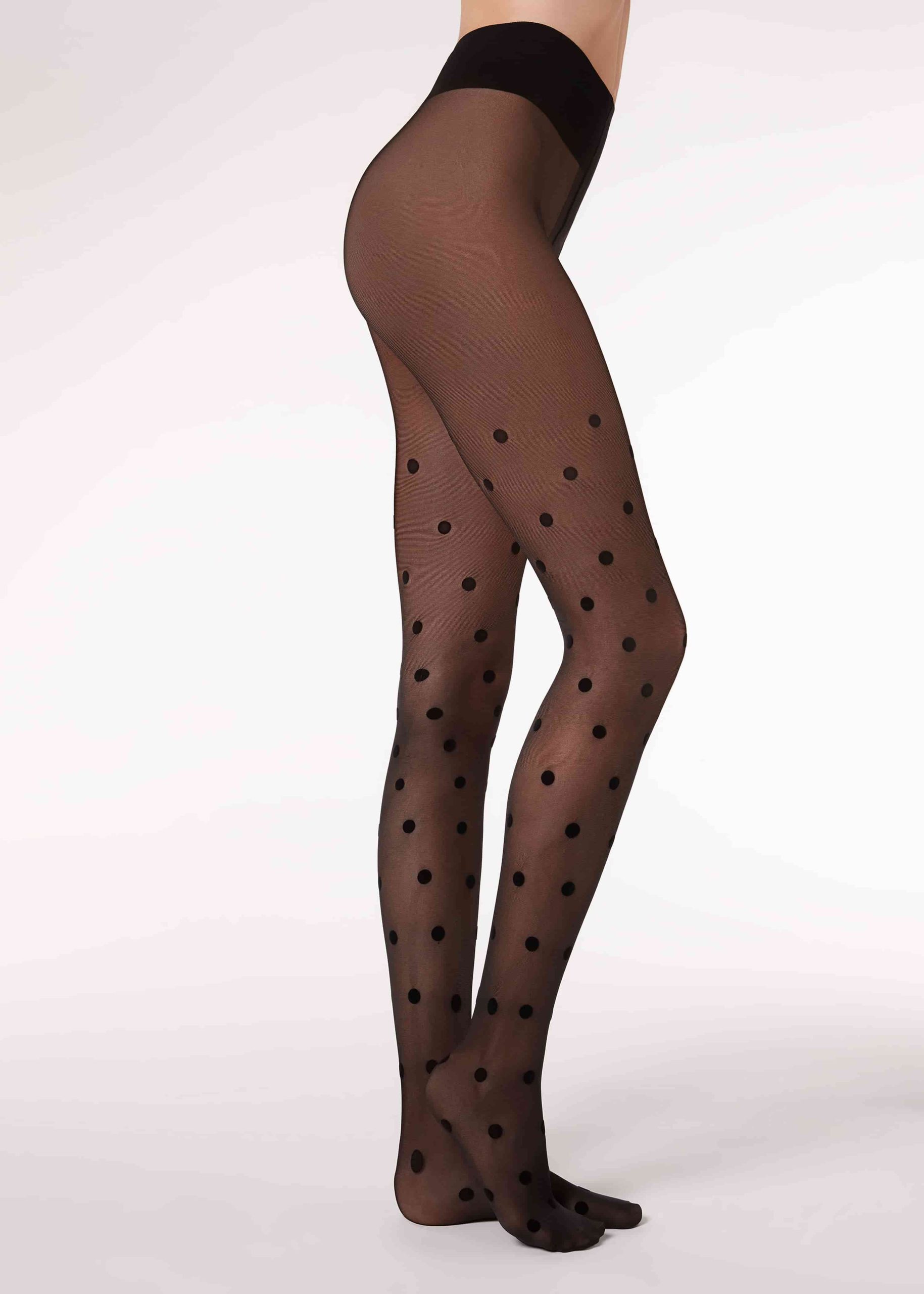 30 denier women’s sheer tights with cotton gusset and a flocked print with all over polka dot motif.