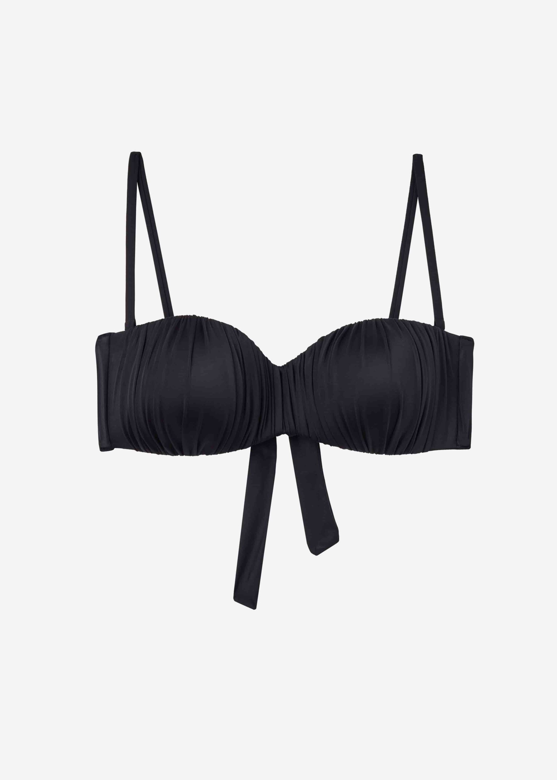 Bandeau bikini top with graduated padding, underwire and side boning to provide good support, perfect for the larger bust. The style features shiny satin-effect fabric embellished with ruching. Adjustable, detachable shoulder straps. Back bow fastening.