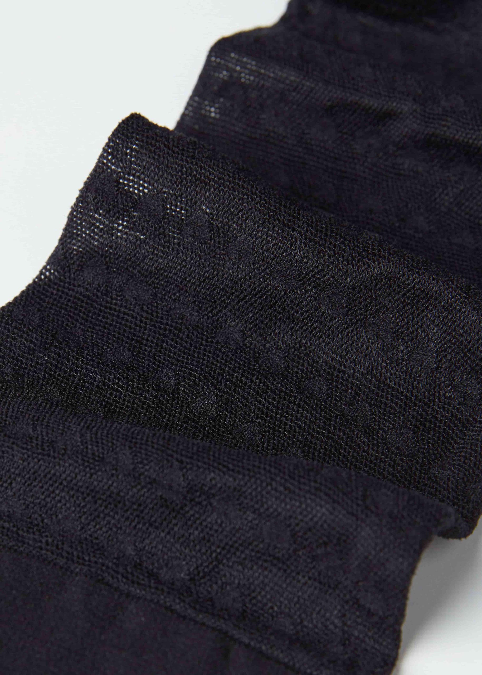 Women’s mesh 70 denier knee-highs socks with an all over heart motif and romantic scalloped cuffs.
