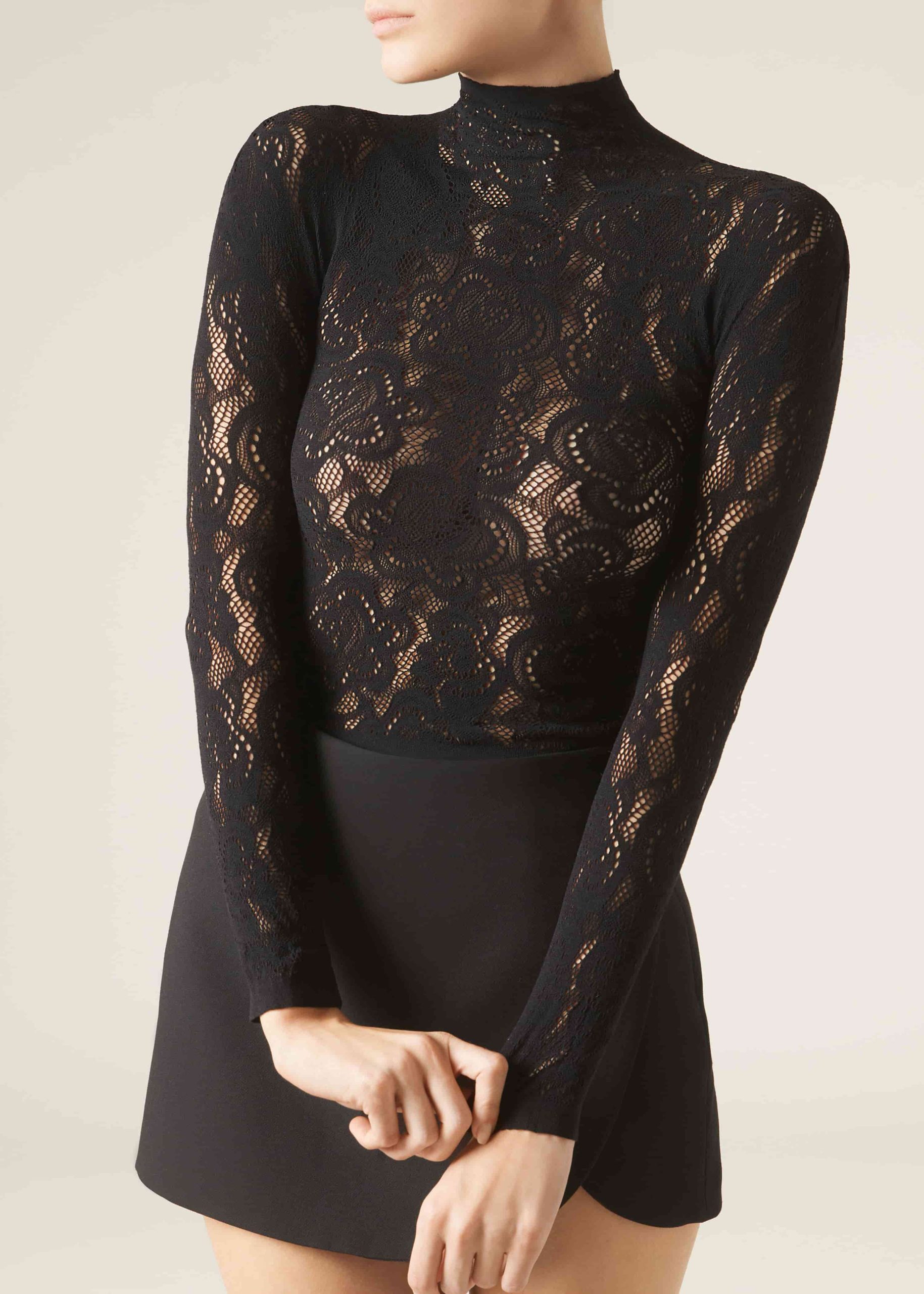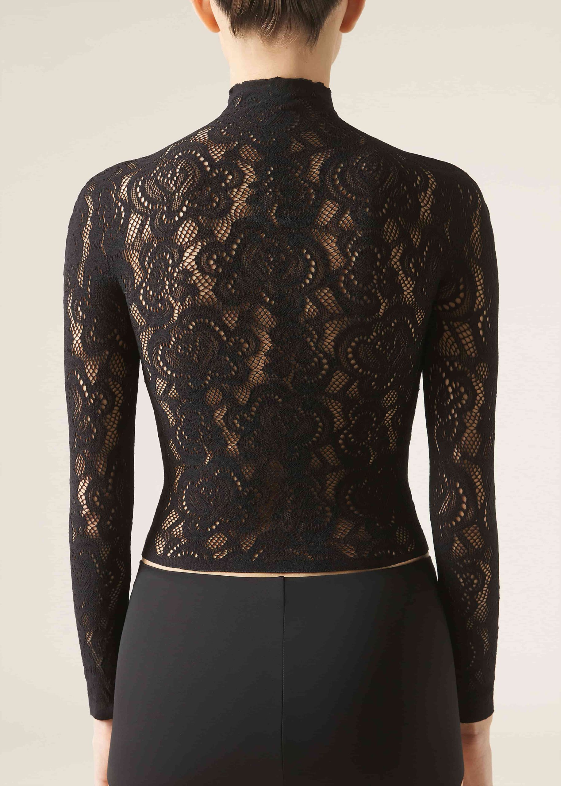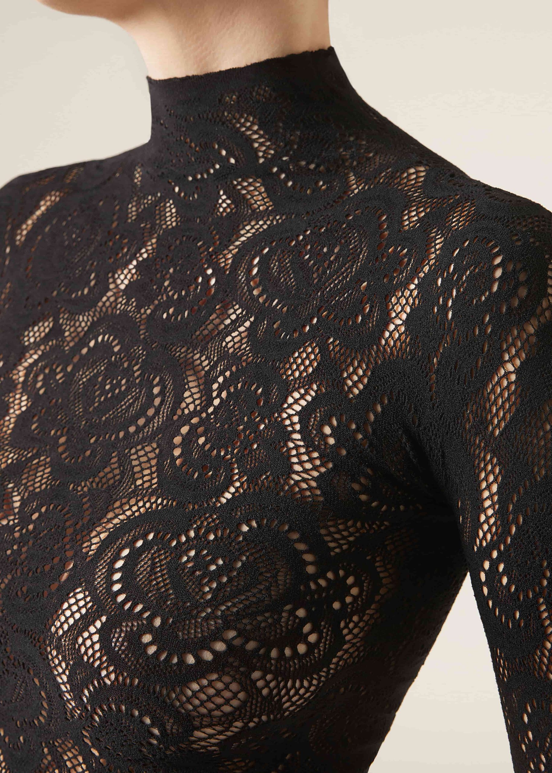 Mesh top with floral pattern and macramé effect, to pair with matching tights MODC2150. With a crater neck and long sleeves, it gives an elegant and sophisticated look.