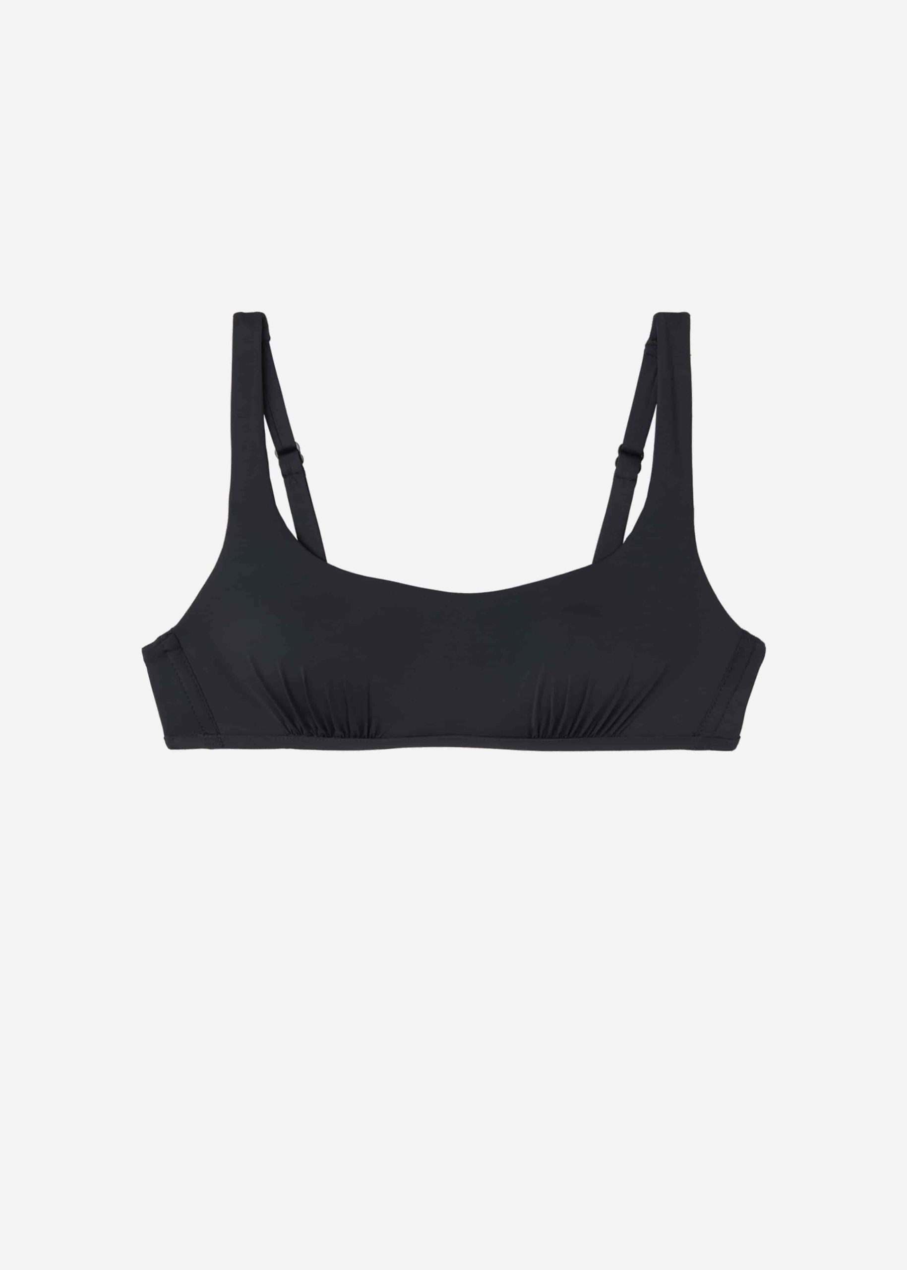 Lightly padded non-wired brassiere bikini top with ruching under the bust. The cut of the cup and side boning ensures good support and maximum comfort. The super-soft fabric makes it pleasant to wear and light and comfortable on the skin. Adjustable, detachable shoulder straps that can be crossed over at the back. Adjustable back clasp fastening to improve the fit of the band.