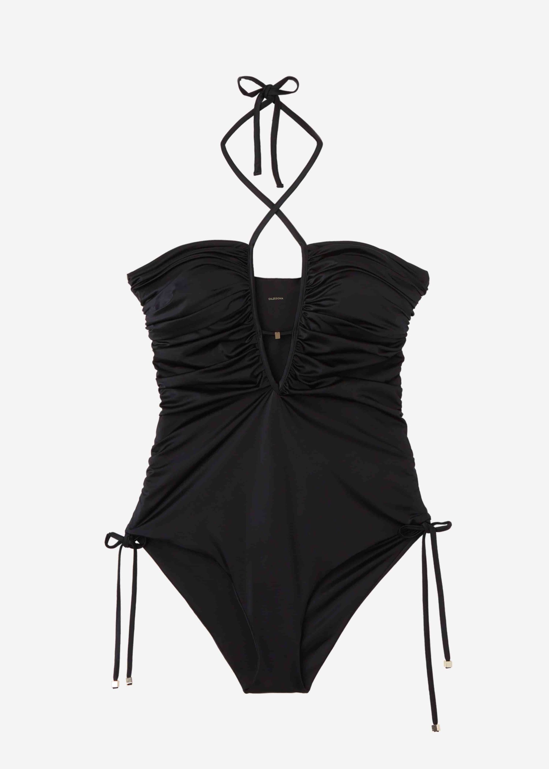 Swimsuit with lightly padded cups and plunging neckline embellished with an elegant gold-tone accessory. The style features adjustable draping with side drawstring to adjust the coverage at the leg. Super-soft and comfortable, shiny, satin-effect fabric. It can be worn tied at the bridge or around the neck, with or without crossing over at the cleavage. Brief-style fit, slightly high leg. Fully lined.