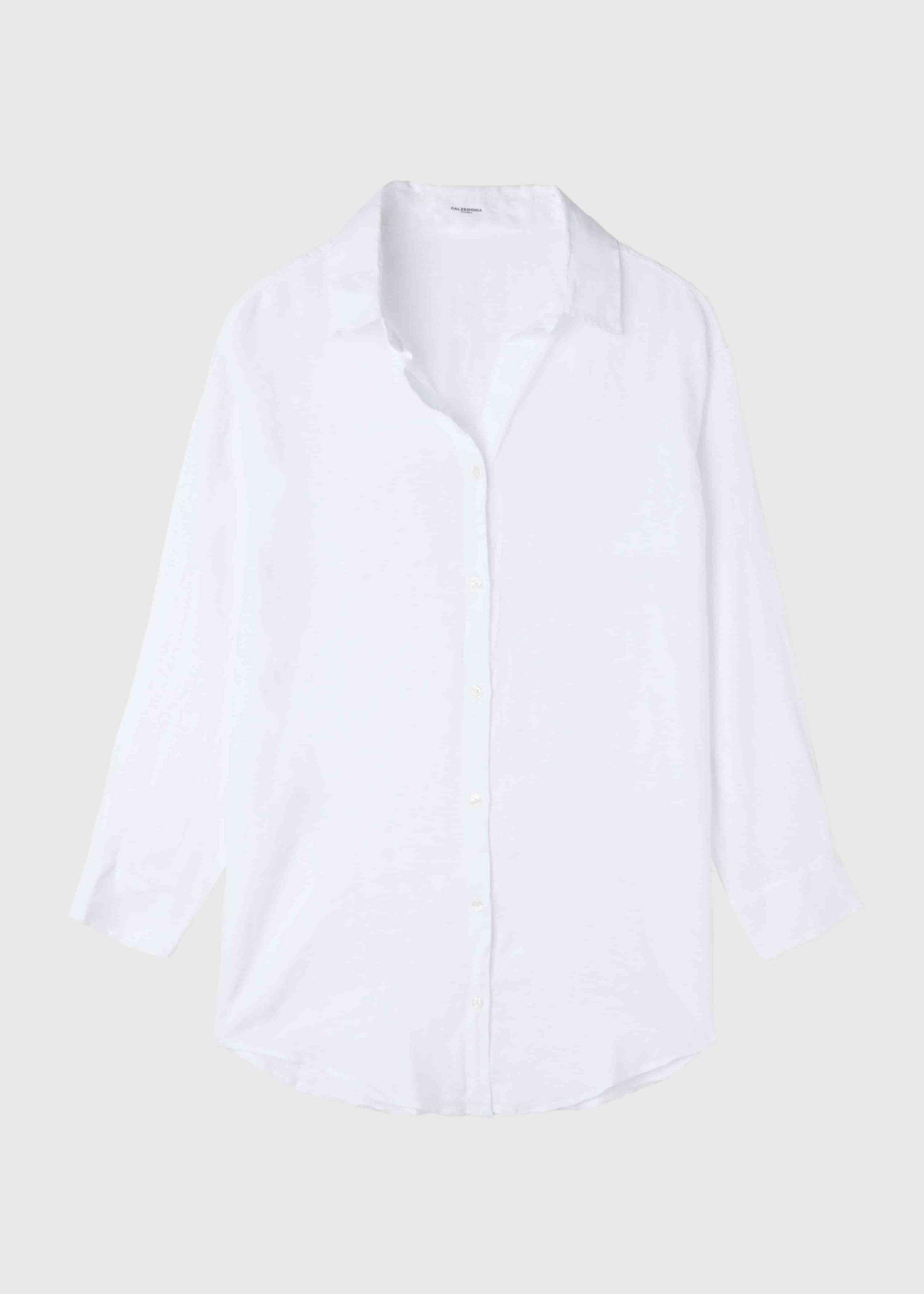 Linen open shirt dress, ideal for those who love natural fibres, with button fastening, shirt collar and long sleeves. Above-the-knee length.