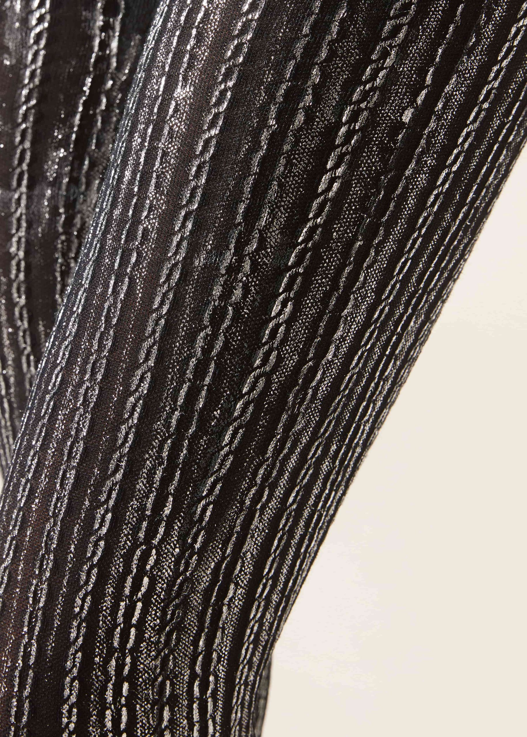 Women’s 100 denier opaque tights with flat seams and invisible gusset. These metallic silver tights feature a cable pattern.