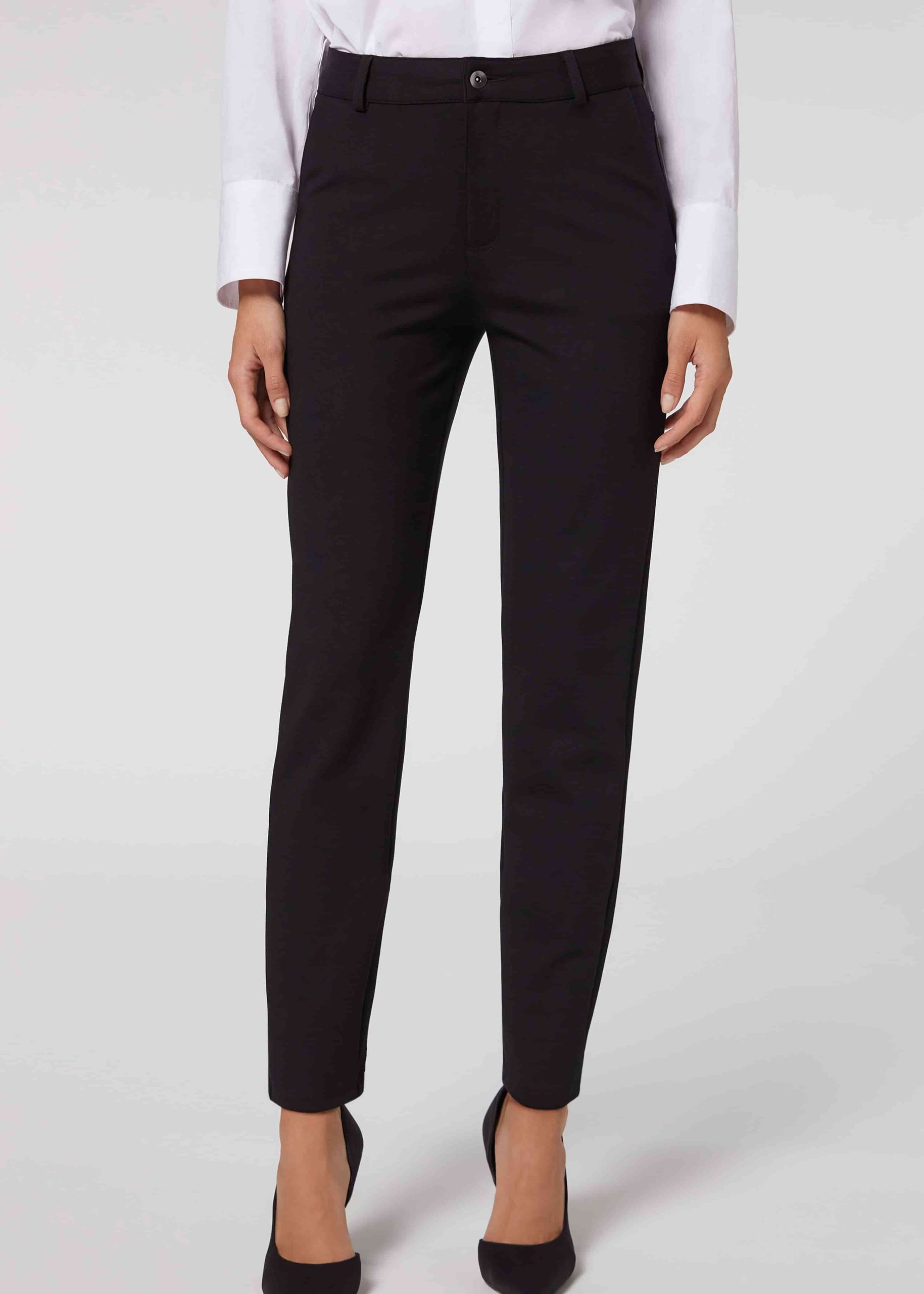 Women’s slim leggings made from Milano knit with zip, button and belt loops at the waist. Front and back pockets.