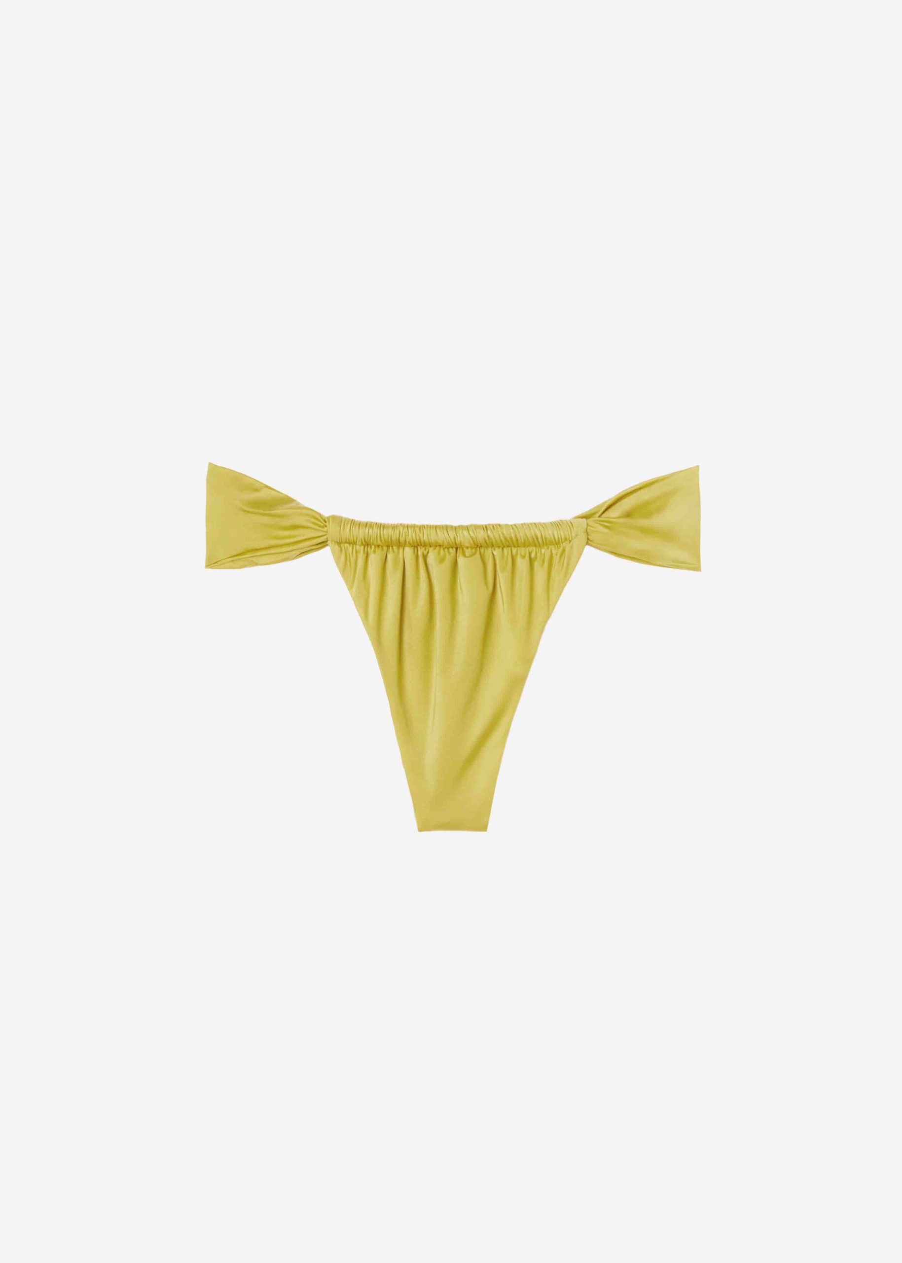 Brazilian bikini bottoms with soft sides and shiny satin-effect fabric embellished with ruching. Fully lined with invisible seams.
