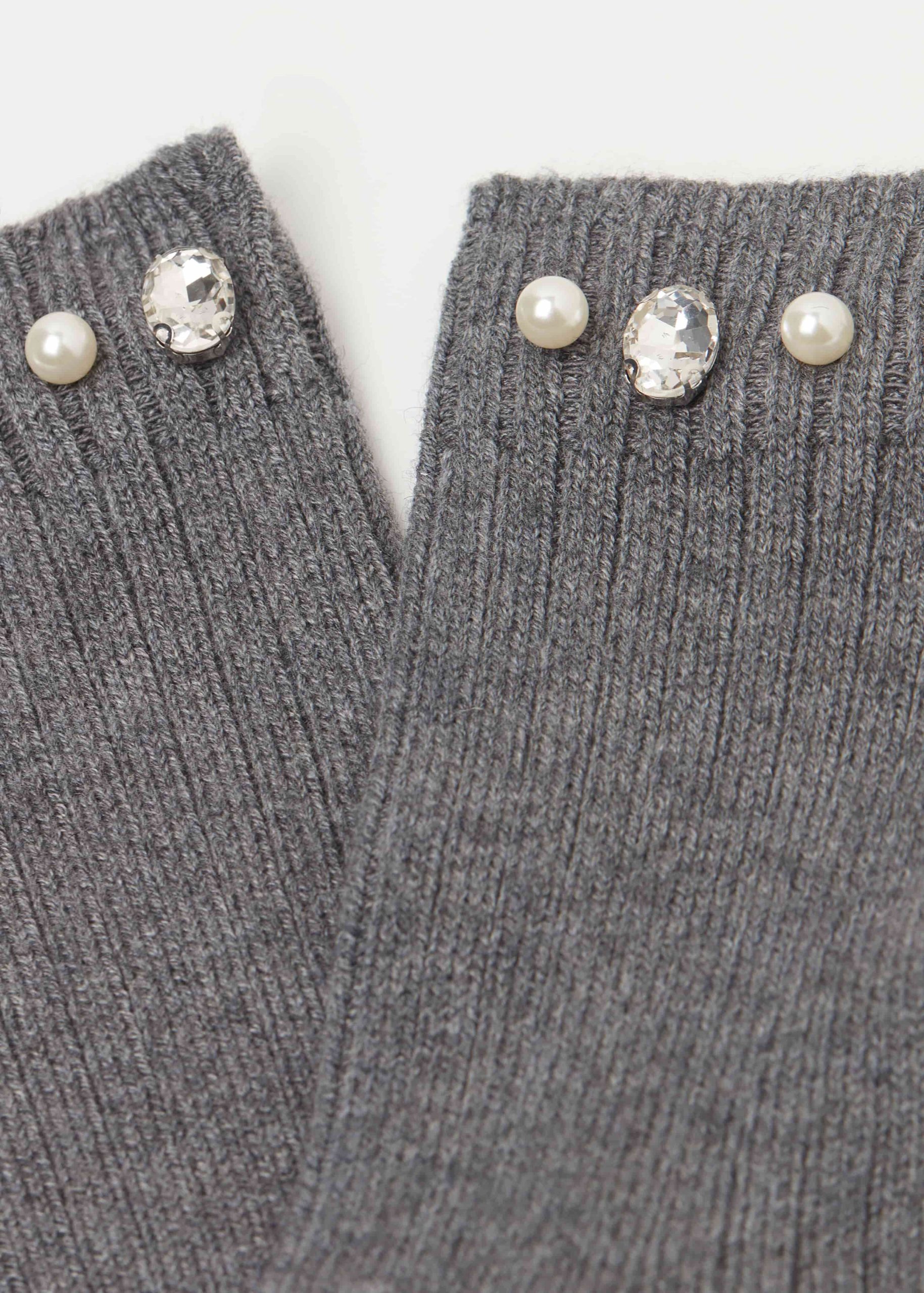 Women’s short socks with warm, thick yarn containing wool, a ribbed finish and pearl and diamanté appliqué details on the trim. Perfect for a sophisticated, refined look in winter, they offer comfort and an elegant style, adding a touch of luxury to your wardrobe.