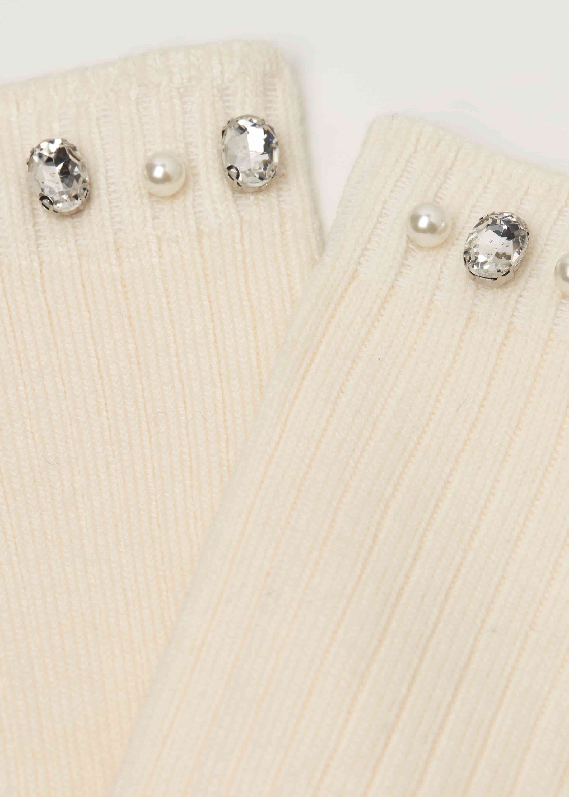 Women’s short socks with warm, thick yarn containing wool, a ribbed finish and pearl and diamanté appliqué details on the trim. Perfect for a sophisticated, refined look in winter, they offer comfort and an elegant style, adding a touch of luxury to your wardrobe.