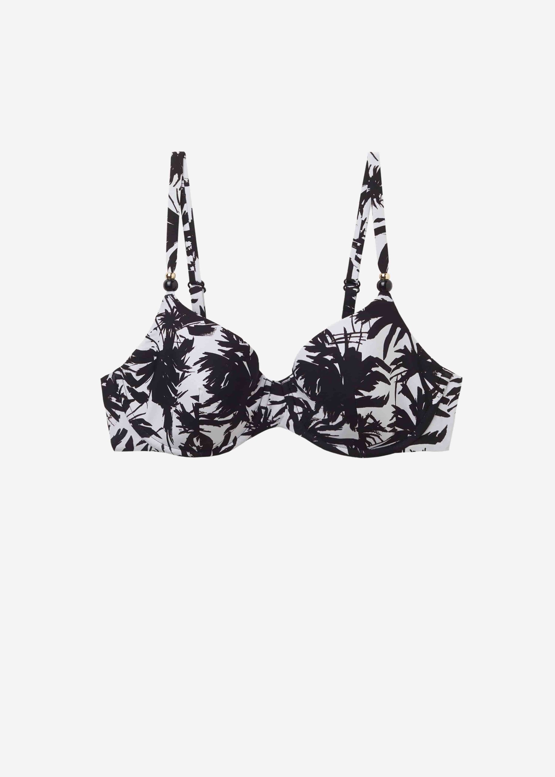 Push-up bikini top with light padding and underwire, also suitable for the larger bust. The style features fabric with a black and white palm pattern embellished with two-tone beads. Fixed, adjustable shoulder straps. Back clasp fastening with double adjusters.