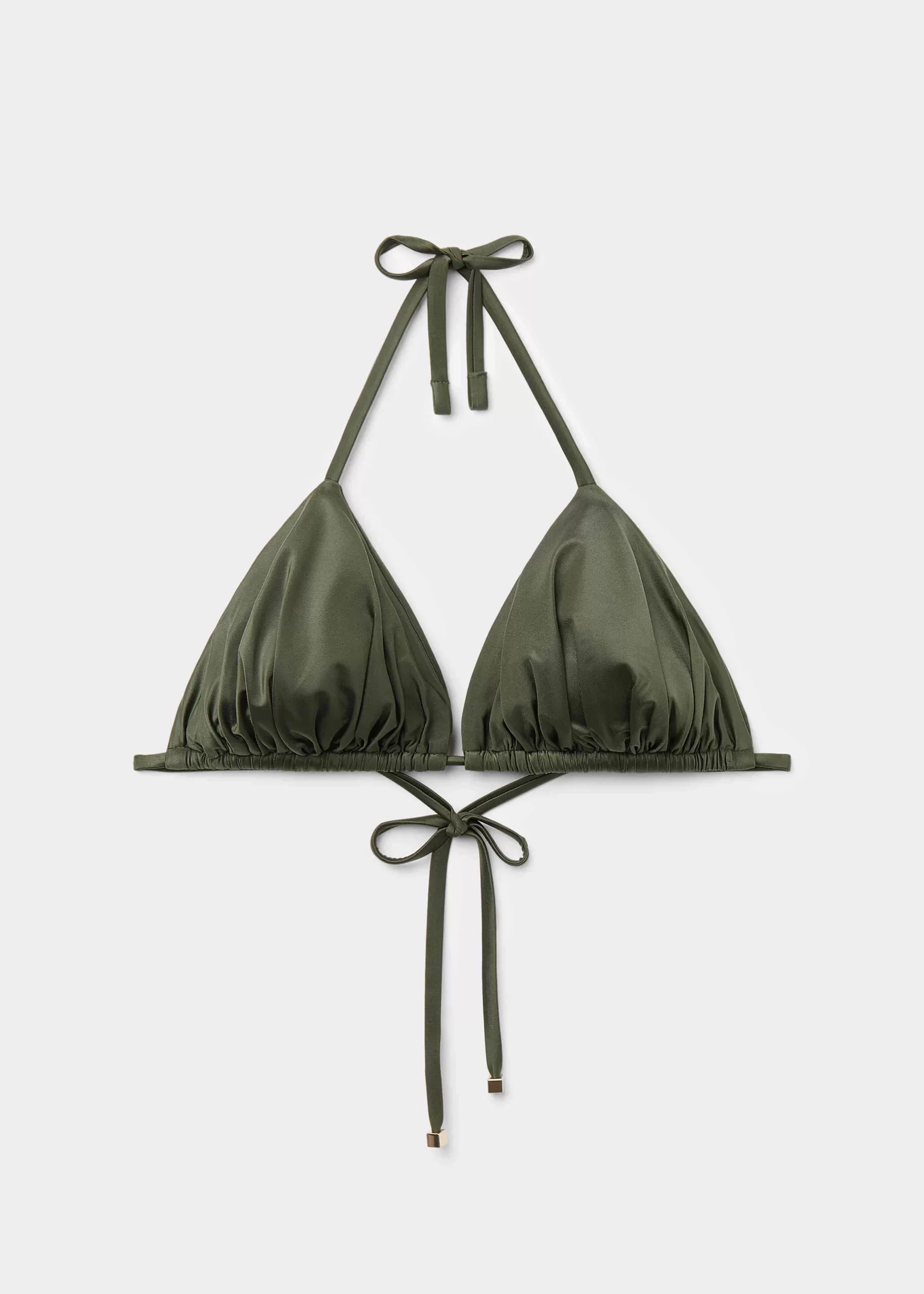 Non-wired triangle bikini top with removable padding. The style features shiny satin-effect fabric embellished with ruching and gold-tone ends. The shoulder straps have eyelets on the ends so they can be hooked onto the back band or tied around the neck. Thin tie fastening at the back.