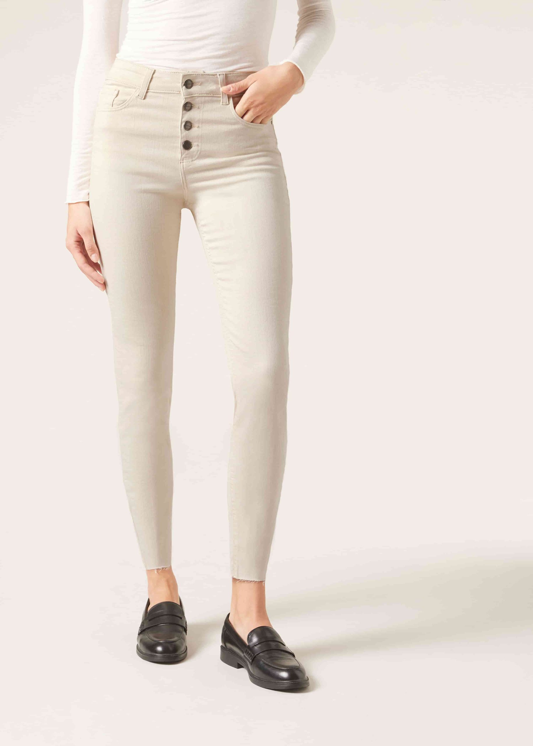 Women’s super-skinny five-pocket jeans with button fastening and belt loops at the waist, in super-comfortable, ultra-stretch fabric. Raw cut with subtle fringing at the hem.