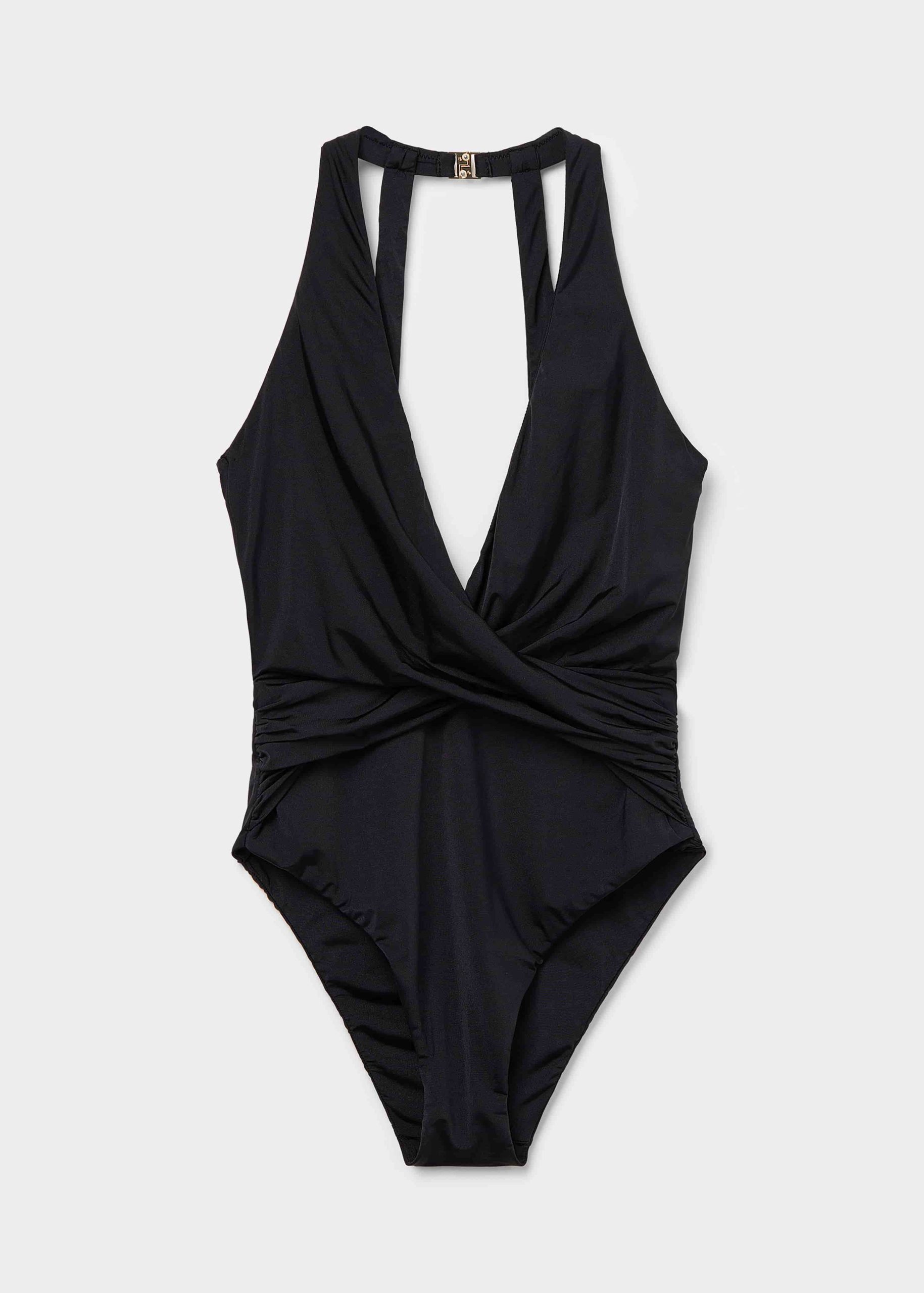 Swimsuit in soft microfibre with no underwire or padding for a natural effect. The style features a plunging neckline with crossover draping at the front. Fully lined with invisible seams for a smooth shape. Brief-style fit, slightly high leg.