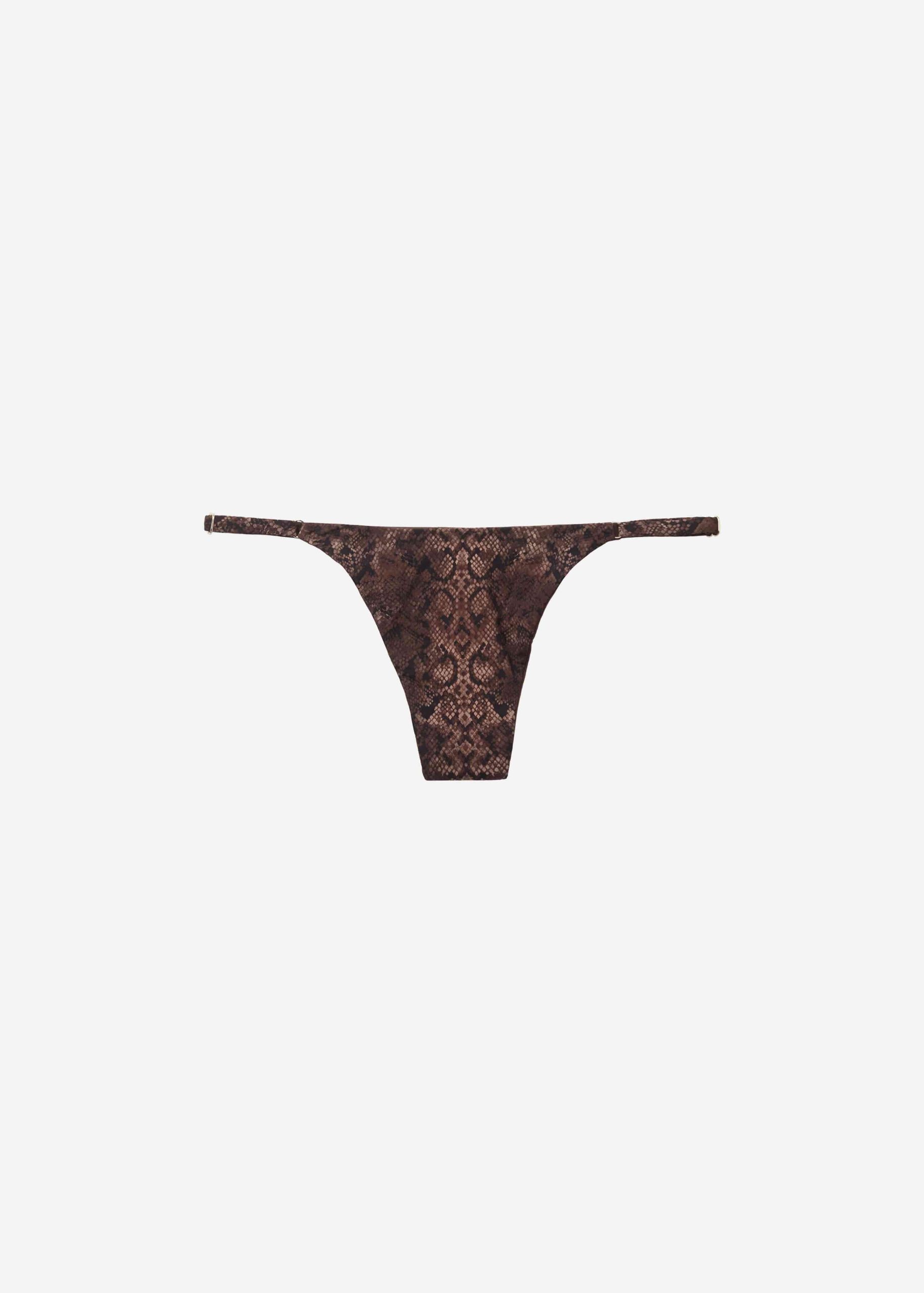 Thong bikini bottoms with thin, adjustable ties at the hips. Thanks to the slightly rounded front waist, they can be worn with a regular fit or with a higher leg at the hips to enhance your figure. The style features a sophisticated dark brown tropical print, embellished with nickel-free rings. Fully lined with invisible seams.