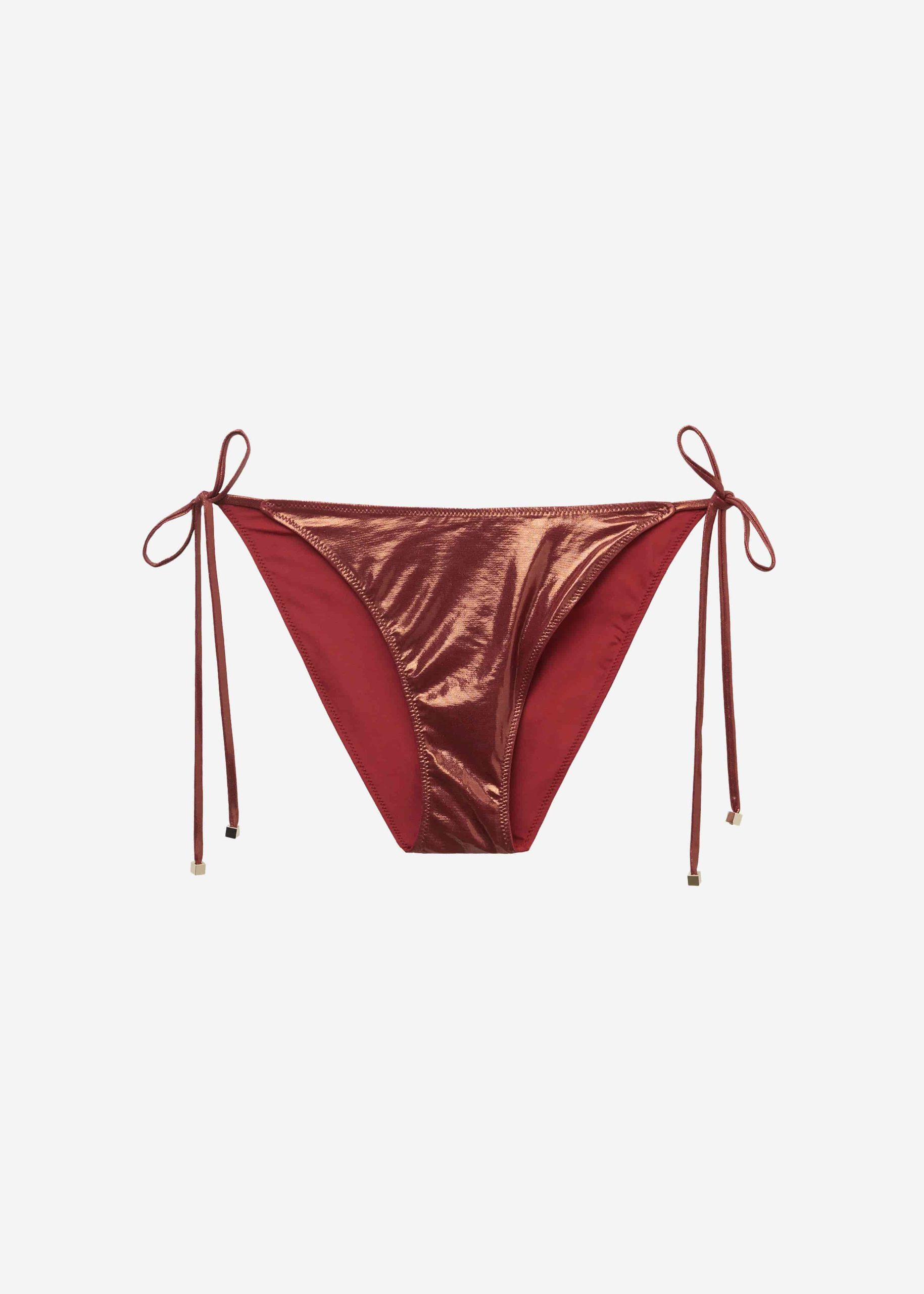 Bikini bottoms with ties at the hips to adjust the fit. The slightly rounded waist at the front allows for wear with classic coverage or a higher leg, depending on your body shape. Ultra-shiny, metallic-effect fabric. Fully lined with invisible seams.