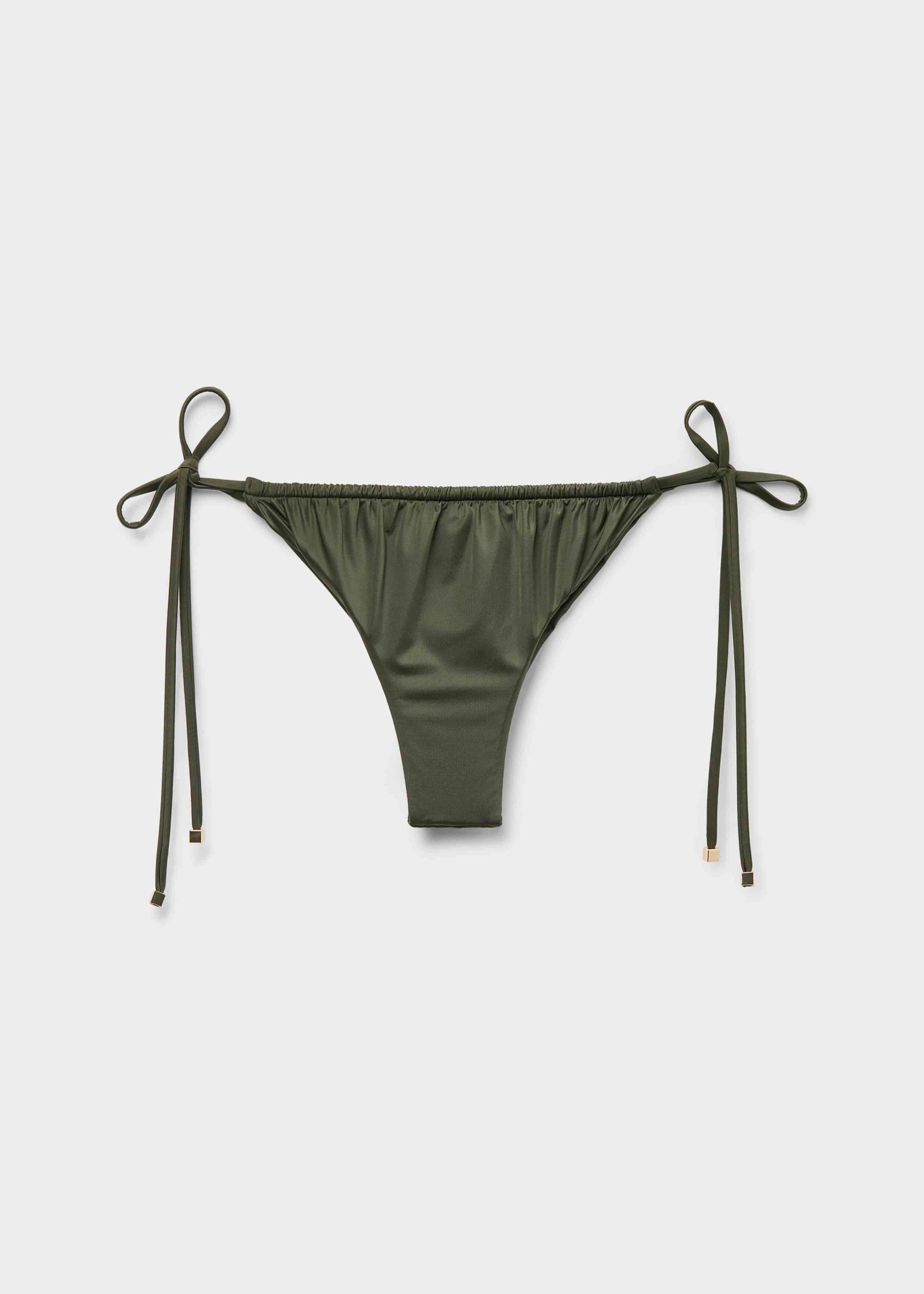 Brazilian bikini bottoms with tie fastening at the hips to adjust the fit. The style features shiny satin-effect fabric embellished with ruching and gold-tone ends. Fully lined with invisible seams.