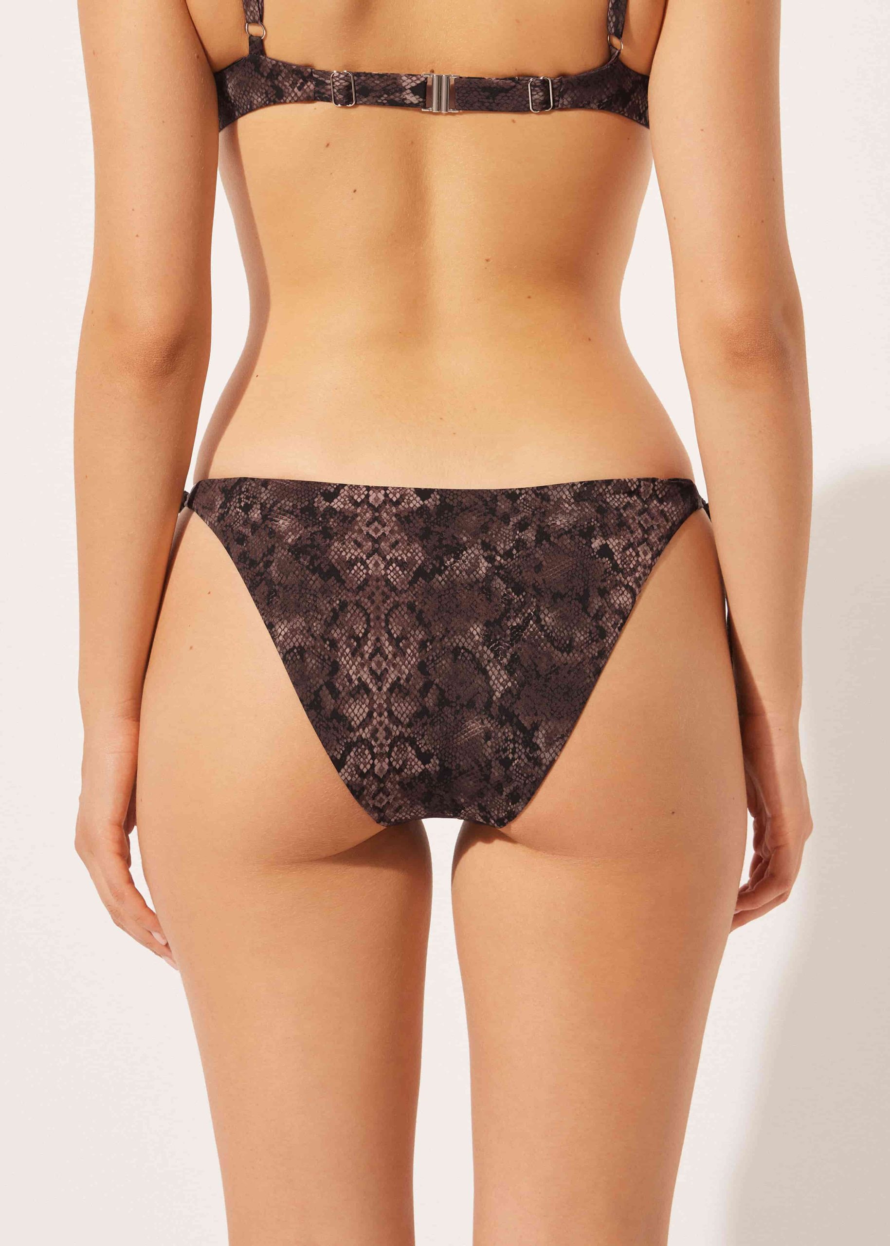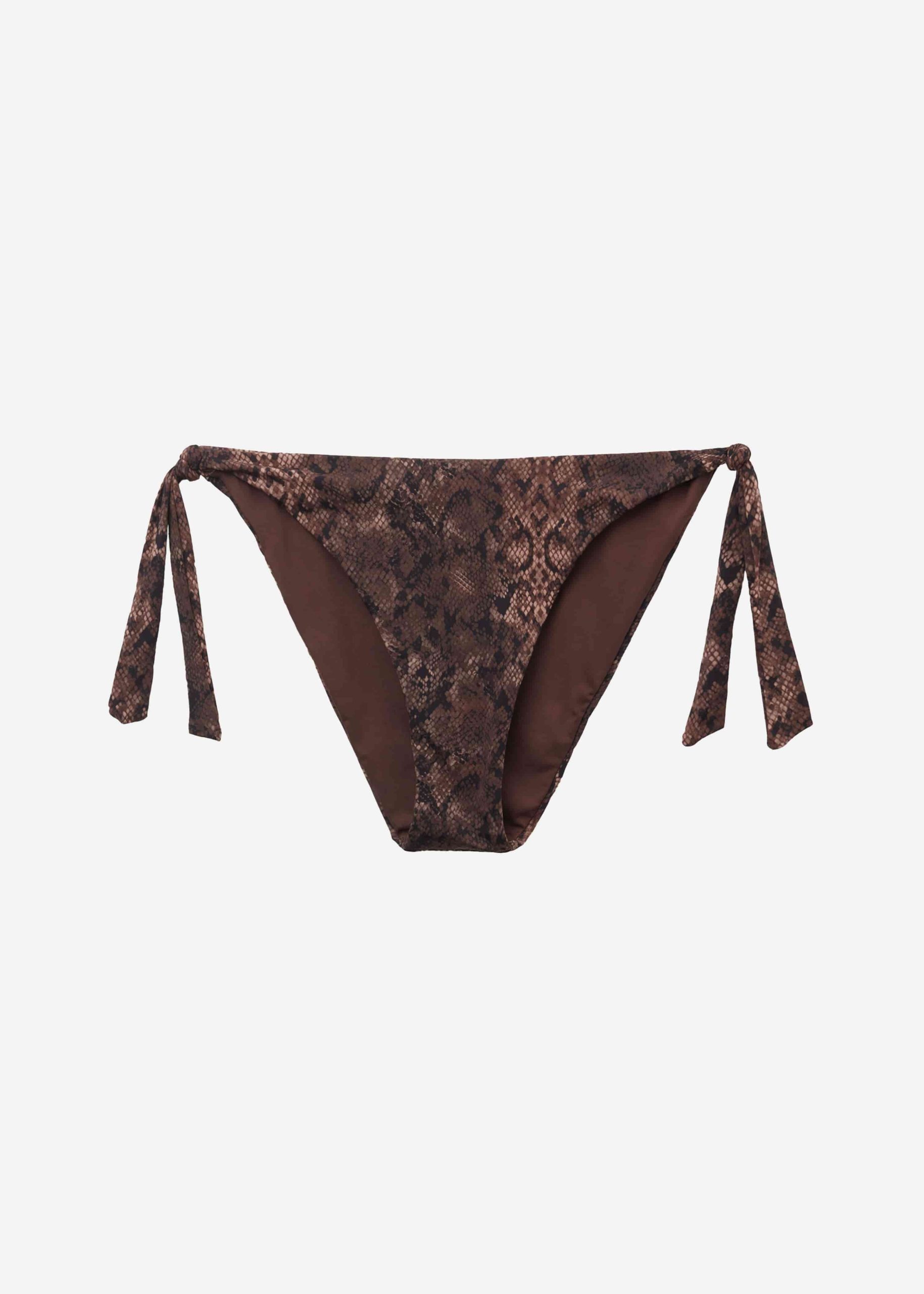 Bikini bottoms with bow fastening at the hips to adjust the fit. The slightly rounded waist at the front allows for wear with classic coverage or a higher leg, depending on your body shape. The style features a sophisticated dark brown tropical print. Fully lined with invisible seams.