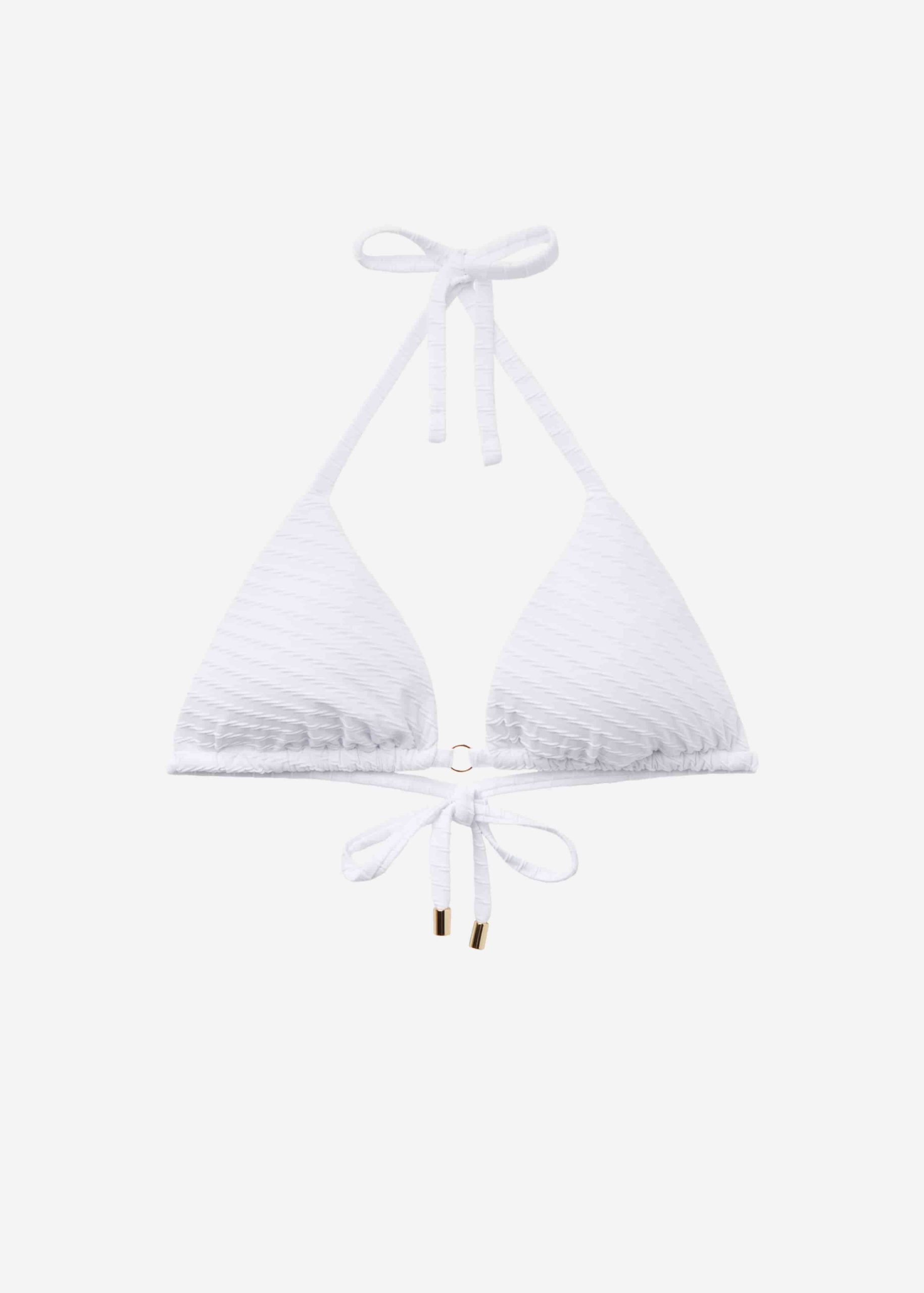 Slide triangle bikini top with removable padding and no underwire for a natural effect. The style features a super-soft, diagonal-patterned 3D fabric. The shoulder straps have eyelets on the ends so they can be hooked onto the back band or tied around the neck. Thin tie fastening at the back with silver-tone ends.
